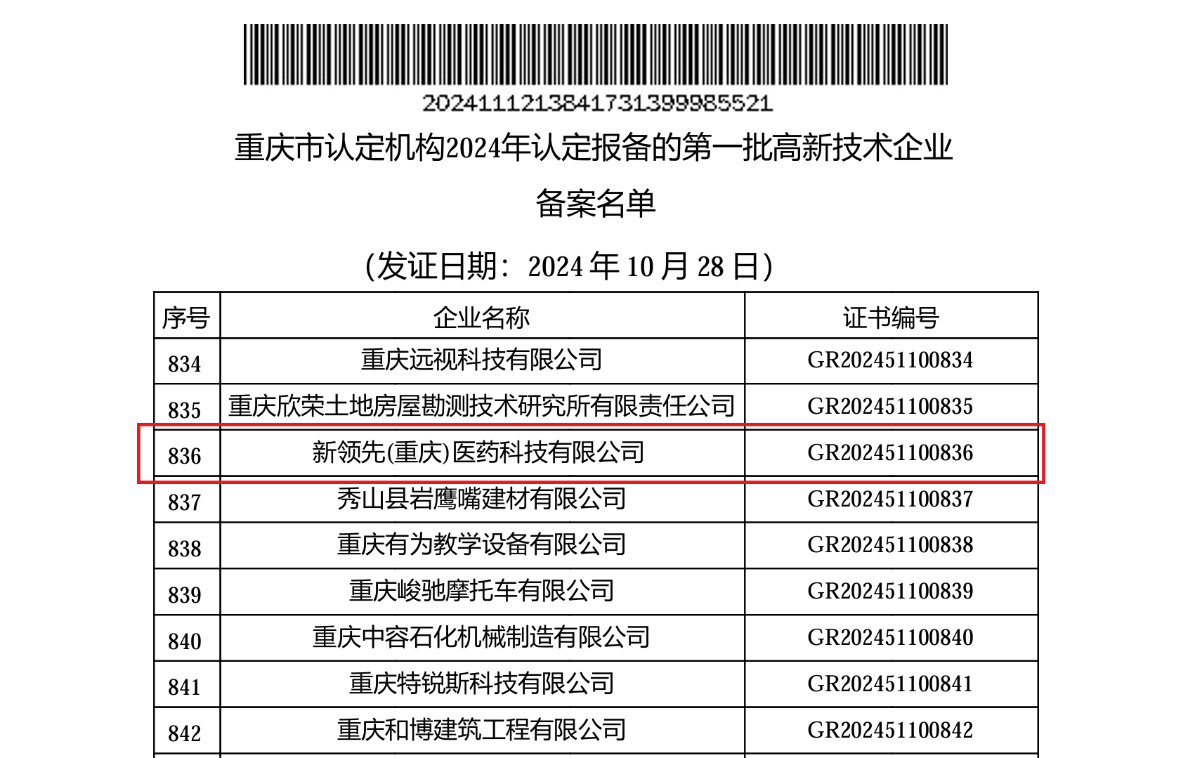 喜報(bào) | 新領(lǐng)先(重慶)醫(yī)藥科技通過(guò)國(guó)家“高新技術(shù)企業(yè)”認(rèn)定