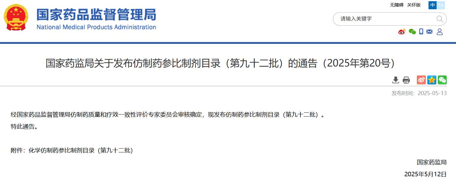 國家藥監(jiān)局關(guān)于發(fā)布仿制藥參比制劑目錄(第九十二批)的通告(2025年第20號(hào))