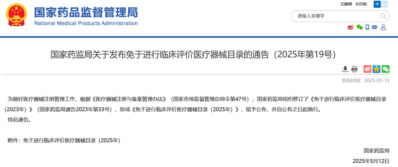 國家藥監(jiān)局關(guān)于發(fā)布免于進(jìn)行臨床評(píng)價(jià)醫(yī)療器械目錄的通告(2025年第19號(hào))