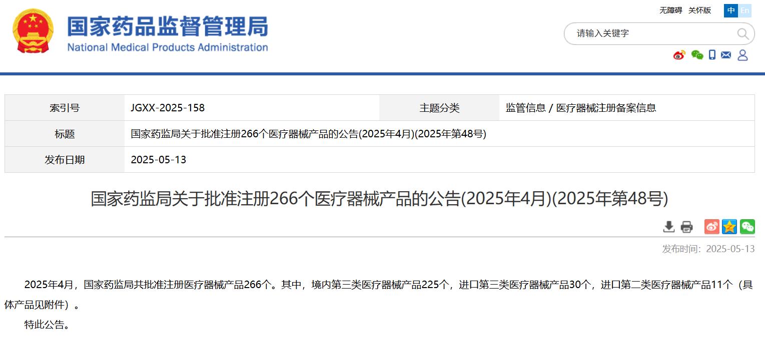 國家藥監(jiān)局關(guān)于批準(zhǔn)注冊(cè)266個(gè)醫(yī)療器械產(chǎn)品的公告(2025年4月)(2025年第48號(hào))