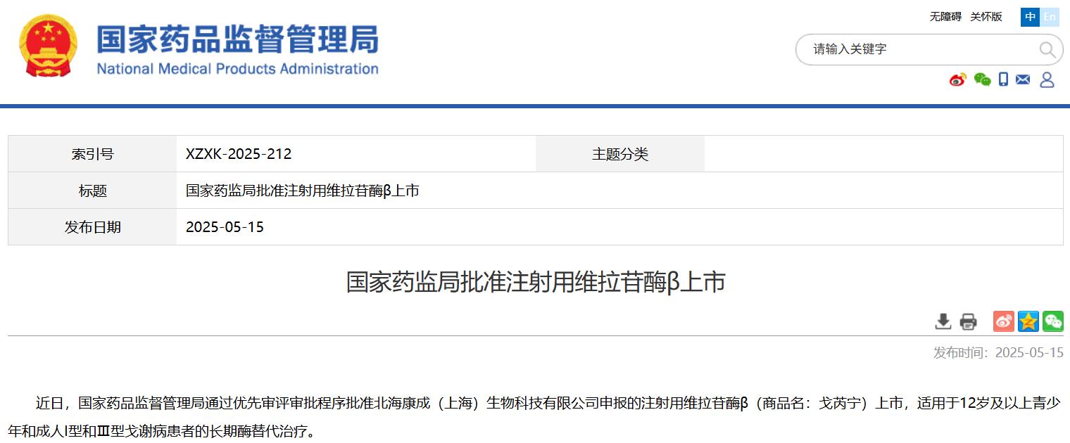 國家藥監(jiān)局批準(zhǔn)注射用維拉苷酶β上市