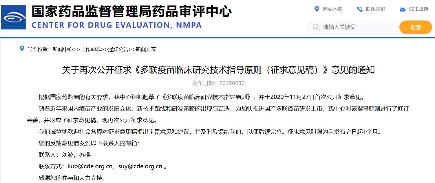 關于再次公開征求《多聯疫苗臨床研究技術指導原則(征求意見稿)》意見的通知