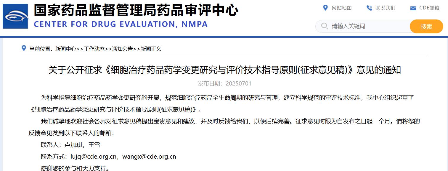 關于公開征求《細胞治療藥品藥學變更研究與評價技術指導原則(征求意見稿)》意見的通知