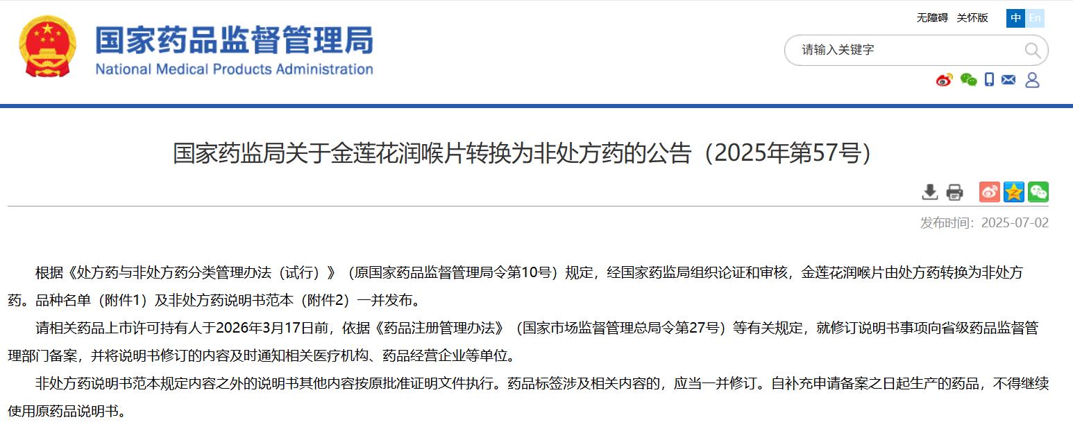 國家藥監局關于金蓮花潤喉片轉換為非處方藥的公告(2025年第57號)