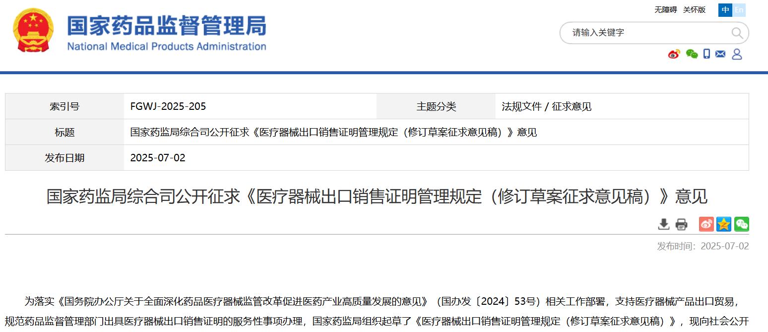 國家藥監局綜合司公開征求《醫療器械出口銷售證明管理規定(修訂草案征求意見稿)》意見