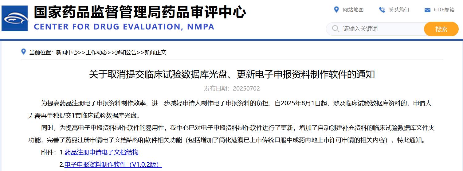 關于取消提交臨床試驗數據庫光盤、更新電子申報資料制作軟件的通知