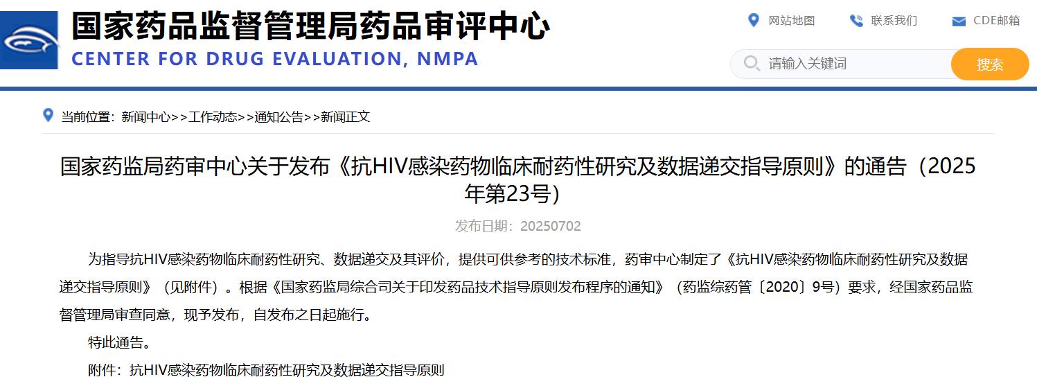 國家藥監局藥審中心關于發布《抗HIV感染藥物臨床耐藥性研究及數據遞交指導原則》的通告(2025年第23號)