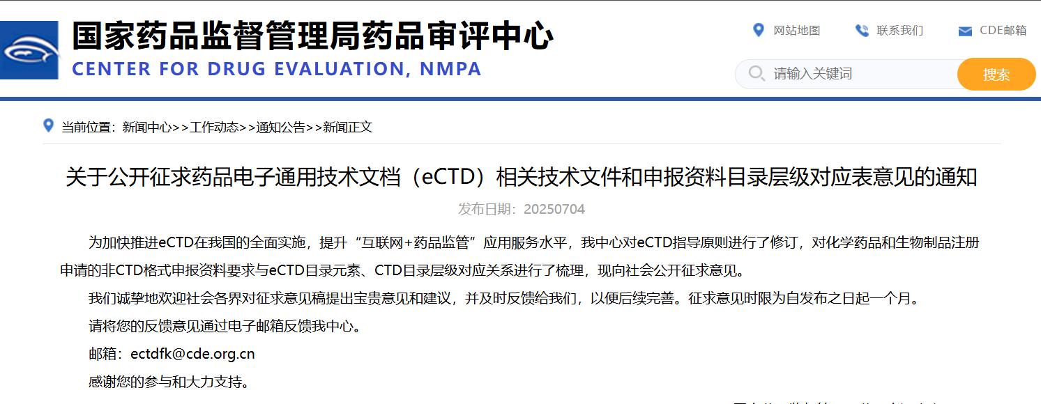 關于公開征求藥品電子通用技術文檔(eCTD)相關技術文件和申報資料目錄層級對應表意見的通知