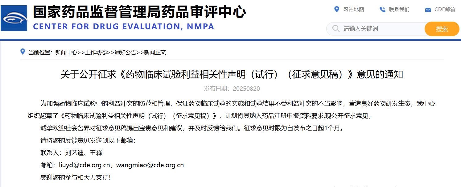 關于公開征求《藥物臨床試驗利益相關性聲明(試行)(征求意見稿)》意見的通知