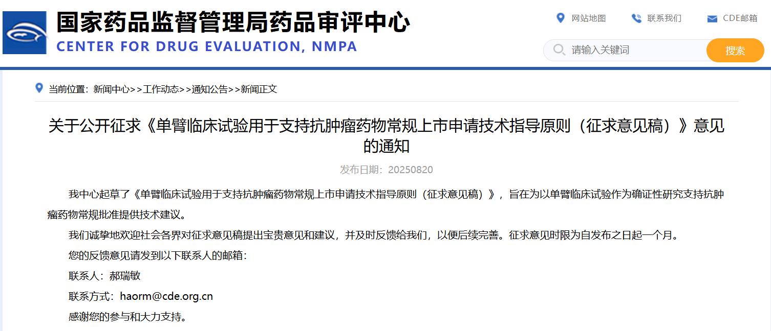 關于公開征求《單臂臨床試驗用于支持抗腫瘤藥物常規上市申請技術指導原則(征求意見稿)》意見的通知