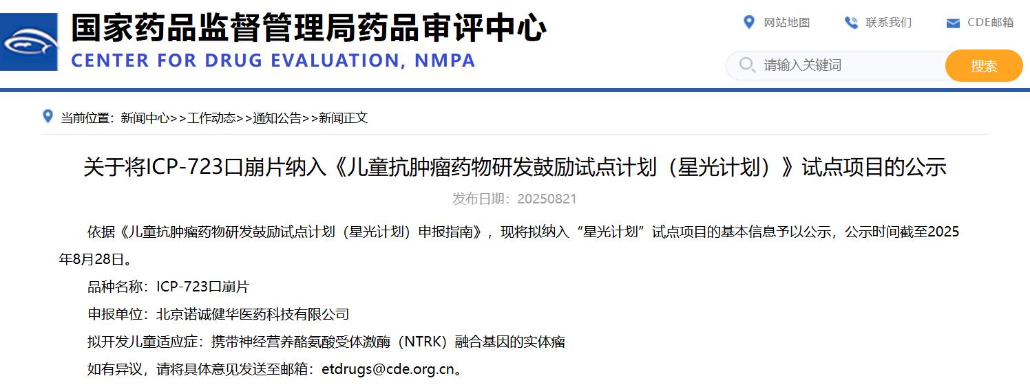 關于將ICP-723口崩片納入《兒童抗腫瘤藥物研發鼓勵試點計劃(星光計劃)》試點項目的公示