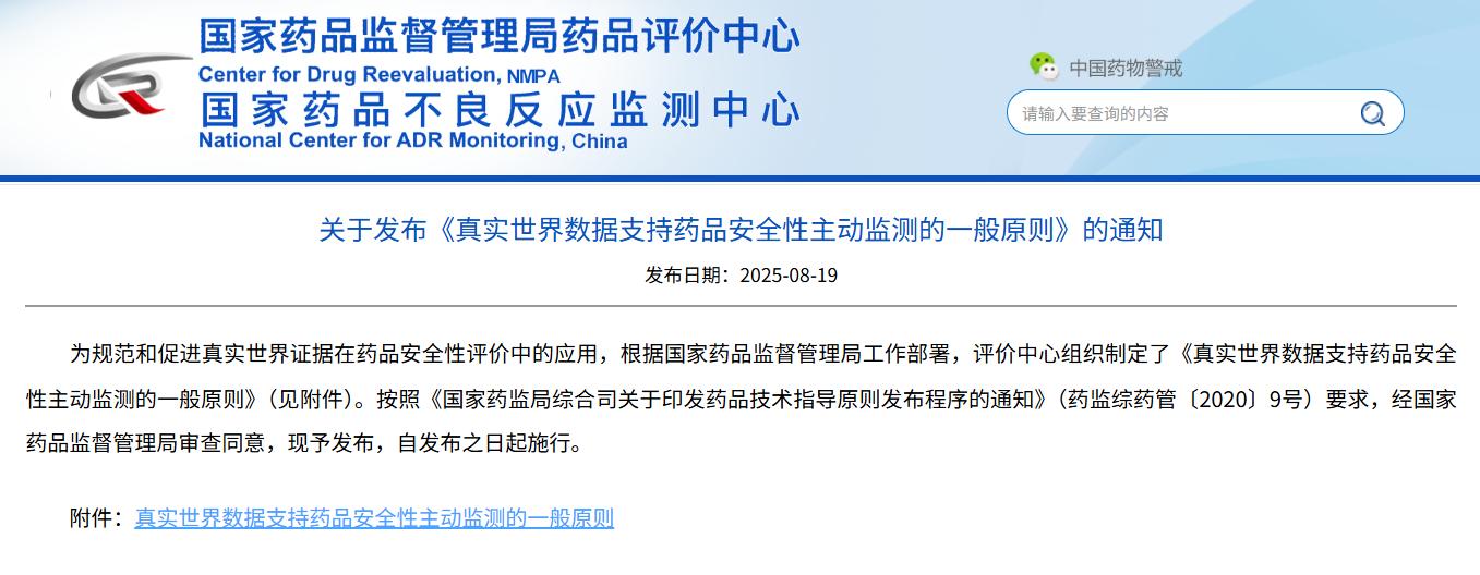 關于發布《真實世界數據支持藥品安全性主動監測的一般原則》的通知