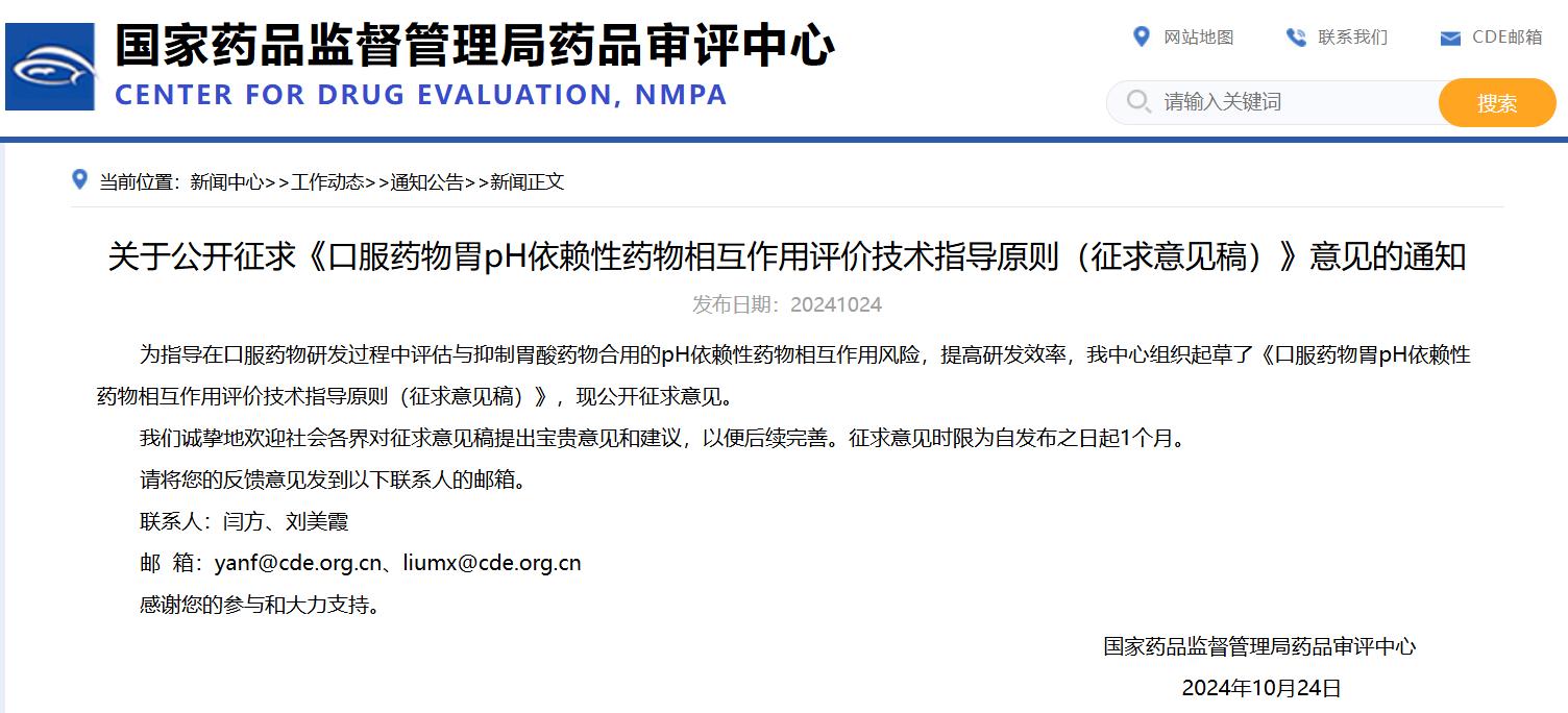 關(guān)于公開征求《口服藥物胃pH依賴性藥物相互作用評價技術(shù)指導(dǎo)原則(征求意見稿)》意見的通知國家藥監(jiān)局