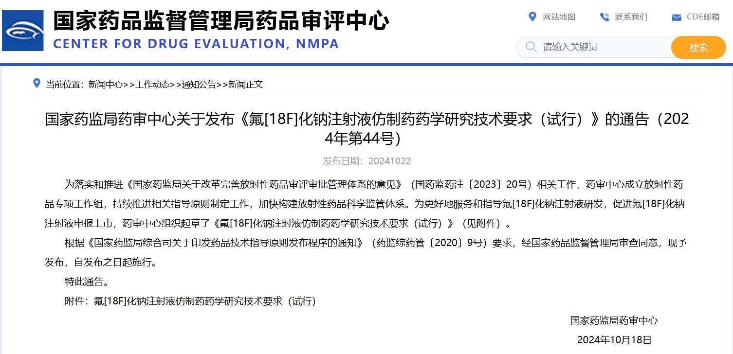 國家藥監(jiān)局藥審中心關(guān)于發(fā)布《氟[18F]化鈉注射液仿制藥藥學(xué)研究技術(shù)要求(試行)》的通告(2024年第44號)