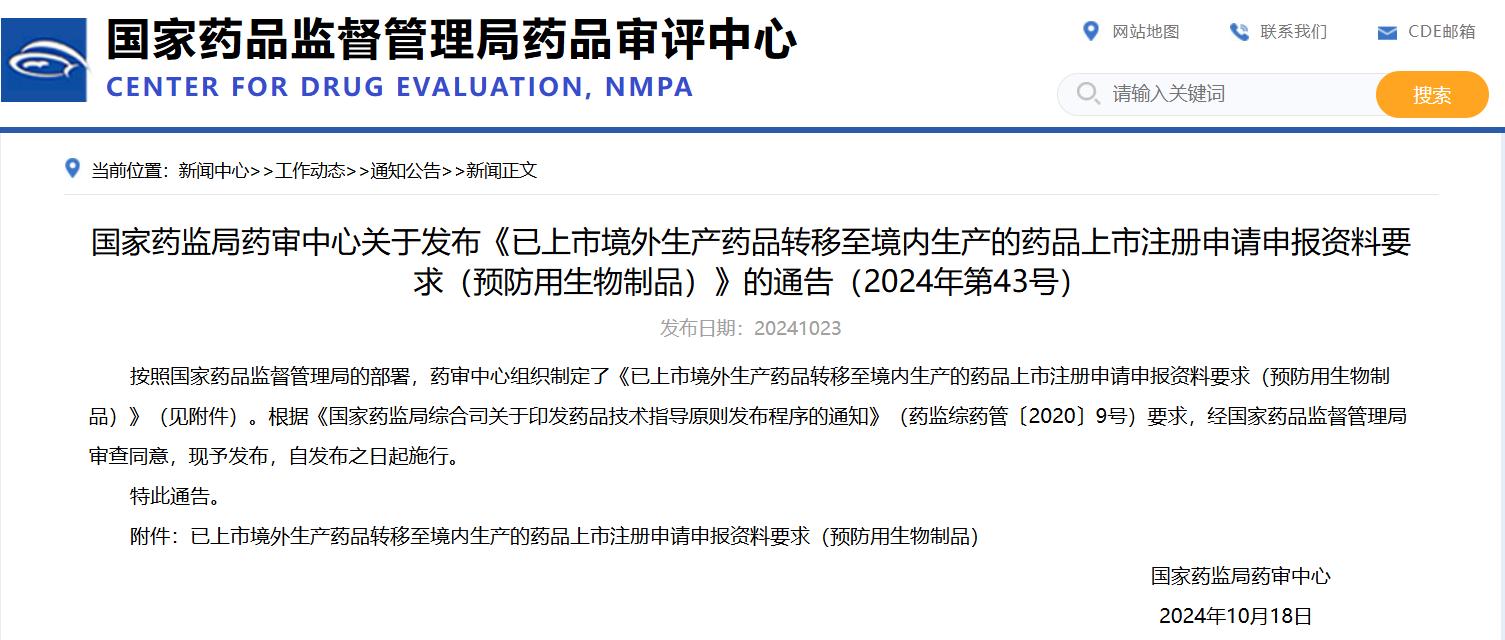 國家藥監(jiān)局藥審中心關(guān)于發(fā)布《已上市境外生產(chǎn)藥品轉(zhuǎn)移至境內(nèi)生產(chǎn)的藥品上市注冊申請申報資料要求(預(yù)防用生物制品)》的通告(2024年第43號)