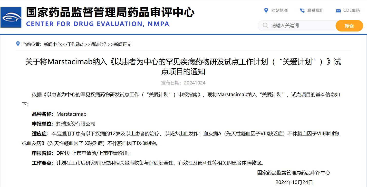 關(guān)于將Marstacimab納入《以患者為中心的罕見疾病藥物研發(fā)試點工作計劃(“關(guān)愛計劃”)》試點項目的通知