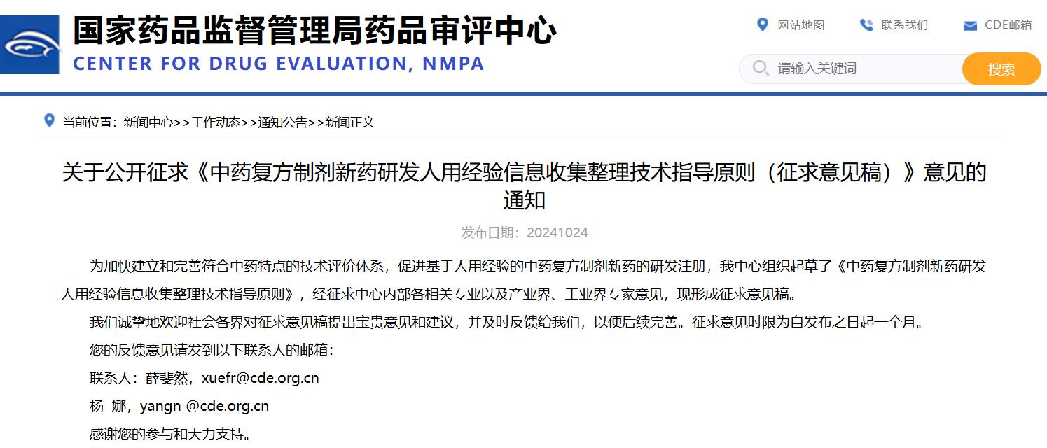 關(guān)于公開征求《中藥復(fù)方制劑新藥研發(fā)人用經(jīng)驗信息收集整理技術(shù)指導(dǎo)原則(征求意見稿)》意見的通知