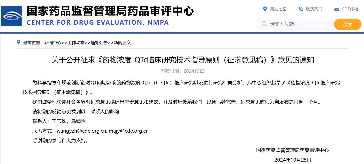 關(guān)于公開征求《藥物濃度-QTc臨床研究技術(shù)指導(dǎo)原則(征求意見稿)》意見的通知