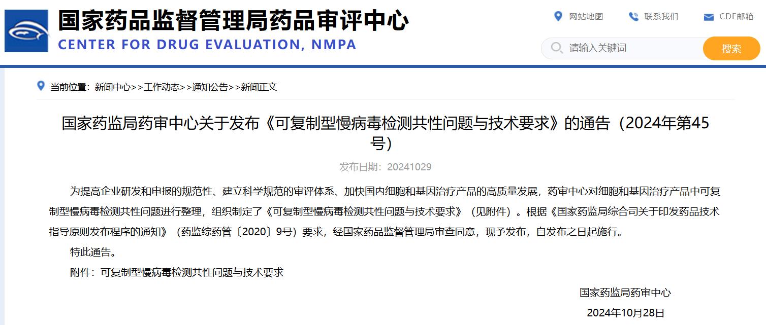 國家藥監(jiān)局藥審中心關(guān)于發(fā)布《可復(fù)制型慢病毒檢測共性問題與技術(shù)要求》的通告(2024年第45號)