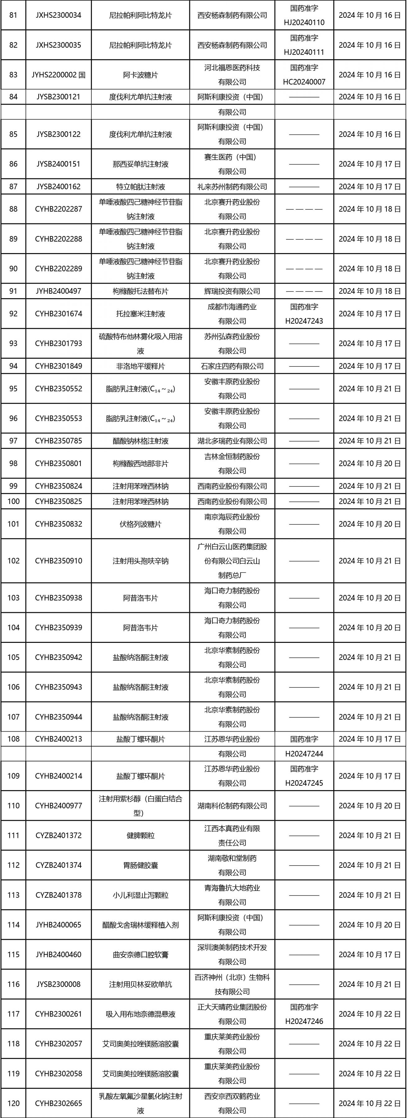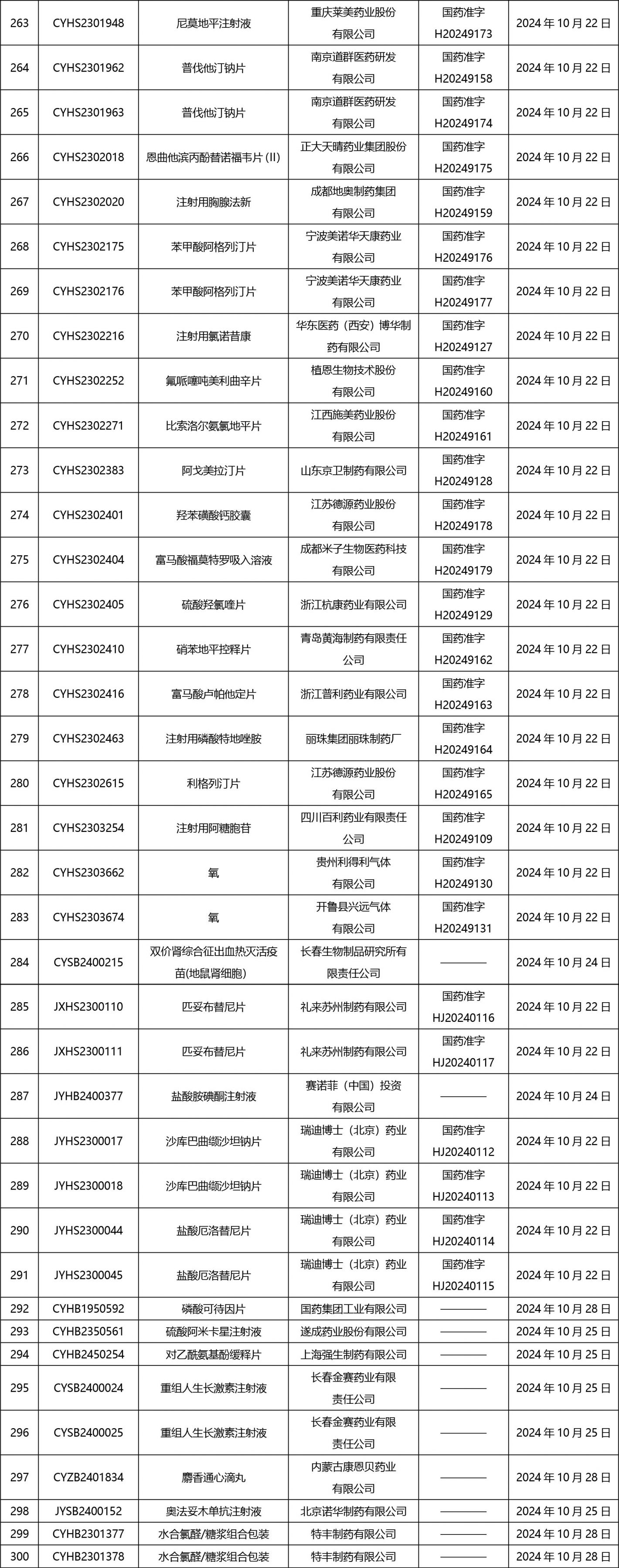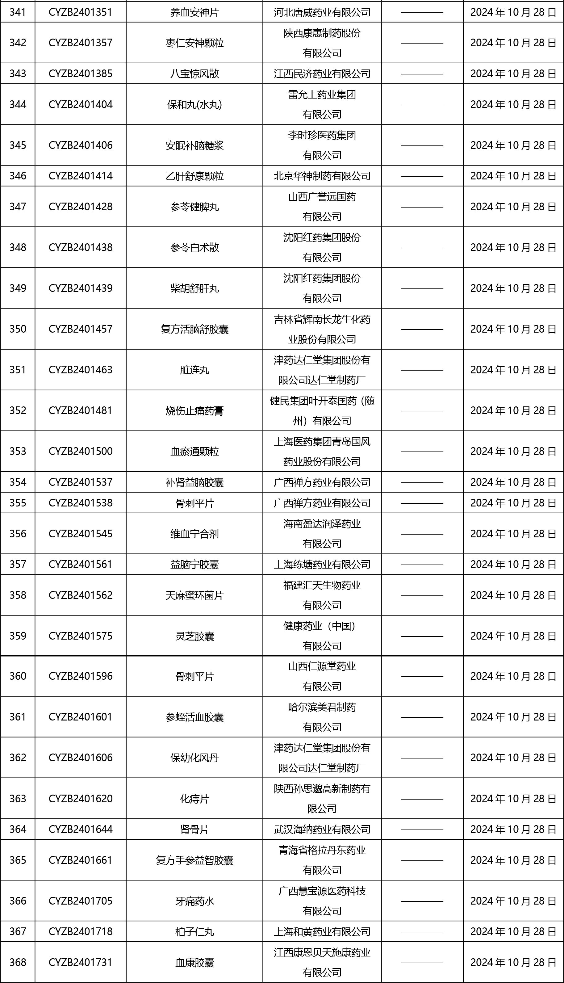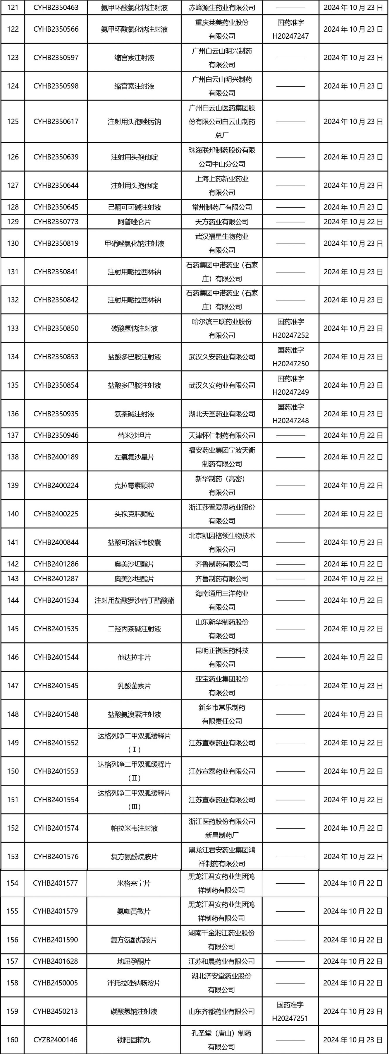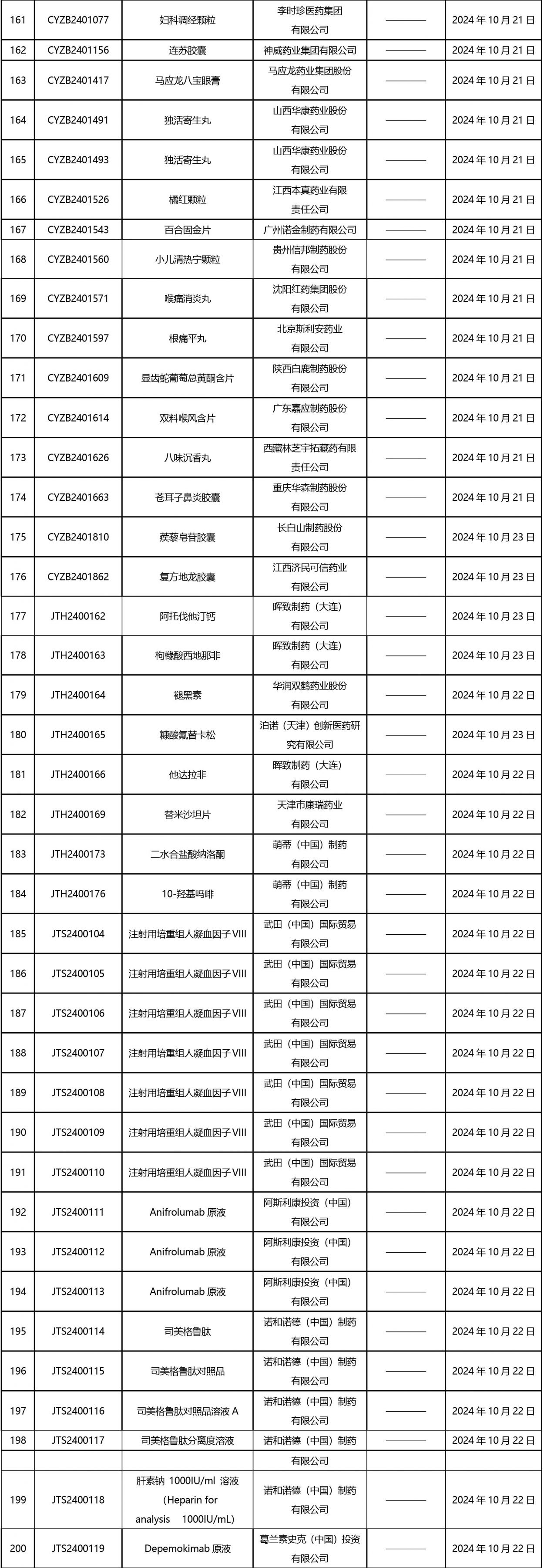 2024年10月21日至2024年11月1日 16:00發(fā)布368個待領(lǐng)取藥品批準(zhǔn)證明文件,其中注射液125個,一致性評價品種45個。